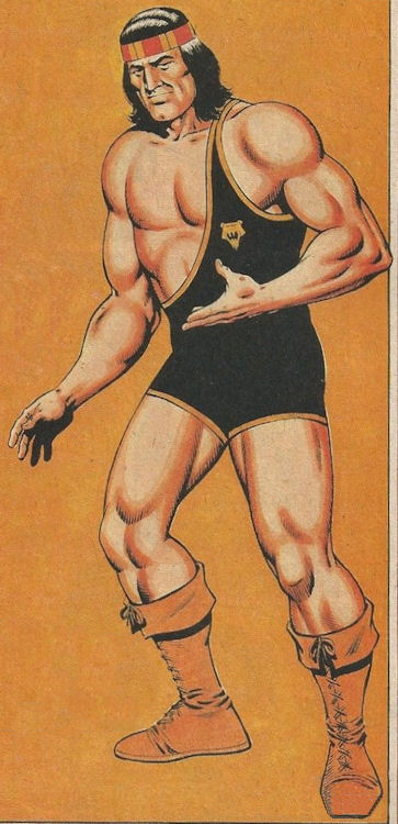 Though most Seminole are to be found in the United States, Johnny Cougar was apparently Canadian. As might be expected given the era he debuted in, some of how he is portrayed reads awkwardly to modern sensibilities - for example, he speaks English with stereotypical "Indian" idioms, using "heap" as an intensifier ("this will be heap interesting") and swearing "By Manitou!" (which, by my admittedly limited understanding of Native American tribes, is associated with an entirely different set of tribes than the Seminole, and so is akin to a staunch Catholic exclaiming "by Buddha!"). Similarly, on at least one occasion, he wears a feathered war bonnet prior to a match, which I again believe should actually be associated with an entirely different set of tribes than the Seminole. However, I think it's only fair to view him in the context of the times he was published, and then he comes across a lot more favourably. Yes, there's some ignorance about the differences between Native American groups, and so he's very much an homogeneous Indian, but people in the U.K. were a lot less aware about such things in the 1960s. On his plus side, he's a non-white lead character in an era where such characters were rare, portrayed in a positive light as the hero of the strip, and artistically speaking, barring the odd clothing faux pas, he's not depicted as a stereotype.