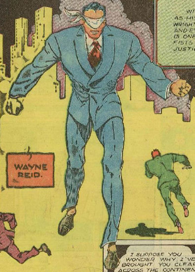 History: Justin Wright was working as a lumberjack when he received a telegram from the law offices of Cronin, Fox and Dedreta, asking him to come to their offices on his 26th birthday. There he was informed that his parents had been murdered many years before (he hadn't even realised he had any), and that he was now of age to inherit their fortune. Wishing for justice for the parents he had never known, he put on a business suit, tied his mother's scarf over his eyes (presumably to emulate blind justice) and became a crimefighter.