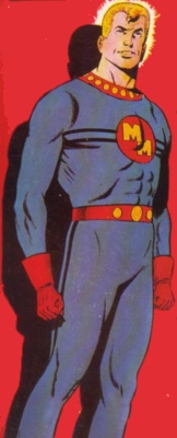 History: "A recluse astro-scientist discovers the key word to the universe, one that can only be given to a boy who is completely honest, studious and of such integrity that he would only use it for the powers of good." The scientist picks young Micky Moran, newspaper copy boy as the recipient of these powers, and exposes him to the energies of a special machine which will enable him to use the secret. However the scientist is critically injured, and dies just managing to tell Micky the key word, "Kimota". When Micky utters this word he transforms into the powerful Marvelman. He later teamed up with Young Marvelman (a.k.a. Marvelman Jnr.) and Kid Marvelman, battling foes such as the mad scientist Dr Gargunza.