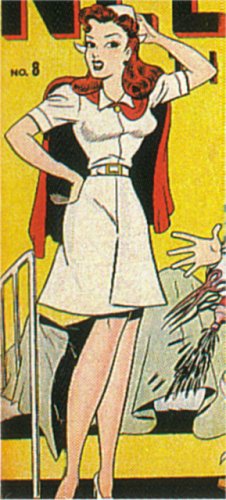 Comments: Nellie the Nurse was one of a number of characters introduced in 1945 in the hope of appealing to a young female audience. Though she has no superpowers, and hence strictly speaking shouldn't be on this site, I figure that if her fellow girls' character Patsy Walker has managed to become a superhero (Hellcat), and Millie the Model has cameoed in Fantastic Four and Dazzler, then it's only a matter of time before we see her again, possibly with superpowers.