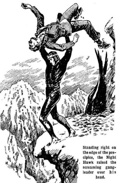 History: When scientist Thurston Kyle's father was murdered by the Benton gang, Britain's greatest criminal band, he devoted the next several years of his life to fighting them, helped by his assistant, "Snub" Hawkins. Eventually he designed a winged suit of armour that allowed him to fly and used it to become the vigilante Night Hawk, King of Air. He dismantled Silas Benton's gang, prompting the crook to flee to Europe, but the relentless Night Hawk pursued him. When Benton disembarked from a train at an Alpine station just inside the Swiss border, thinking he had evaded capture, Night Hawk swooped down and snatched him into the air, then carried him up to a plateau on one of the Jura mountains. Night Hawk then took off his wings and challenged Benton to a fair fight, making it clear there was no safe way to descend without the wings and that only one of them would leave alive. Despite Benton pulling a knife, Night Hawk won the brawl, then, ignoring Benton's tearful and terrified please for clemency, Night Hawk lifted his foe aloft and hurled him over the edge.