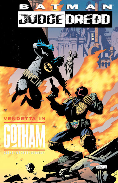 During Dredd's Helter Skelter story (2000 A.D. Prog 1250-1261), dimensional barriers were breached, leading to cameos from other 2000 A.D. strips, including the VCs, Colony Earth, Halo Jones, MACH 1, Robo-Hunter, Sláine, DR and Quinch, and Ace Trucking. In the final Timequake story, the villain of the piece is arrested by a Mega-City judge, providing a tenuous commonality link to Dredd. In Prog 2012, and a crossover not yet reflected on the map above, Sinister and Dexter pursue a target across the multiverse, visiting Mega City One and narrowly dodging Judge Dredd, stop briefly in the world of Flesh, visit the Quartz Zone massacre site (Rogue Trooper), drop in on Nikolai Dante, and encounter Johnny Alpha and Wulf Sternhammer while their target skips ahead and runs into Gene the Hackman (Kingdom); for three of these realities (Sinister/Dexter, Nikolai Dante and Kingdom), this is the first solid confirmation of being part of 2000 A.D.'s multiverse. Finally, and importantly for linking 2000 A.D. to the rest of the Omniverse, Dredd has met DC's Batman multiple times thanks to interdimensional travel, starting with the story Judgement on Gotham.
