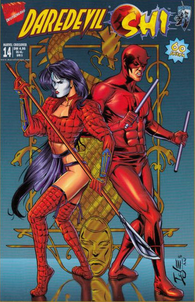 Daredevil and Wolverine have both met Shi, who in turn has met Wildstorm's Grifter, Warren's Vampirella and Top Cow's Cyblade; this last crossover also saw the two heroines interacting with dozens of other characters from independent comics, including but not limited to Cerebus, Omaha the Cat Dancer, Eudaemon, Milk and Cheese, Wolff and Byrd, Hellboy, Kabuki, Samaritan from Astro City (the only confirmed link to the rest of the Omniverse for Astro City that I know of), Usagi Yojimbo, Scud the Disposable Assassin, Megaton Man, the Tick, Mr. Spook from Beanworld, Cascade from Sovereign Seven, and Fone Bone from Bone. Importantly as it provides a link to an otherwised orphaned reality, Shi has also met Peter David's Fallen Angel. And through the Fallen Angel the Omniverse gets a solid link to Joss Whedon's Buffyverse, as the Fallen Angel has met Illyria in what is presumably a merger crossover. |