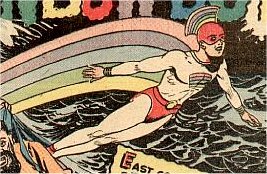 Powers/Abilities: "Rainbow control" (similar to the later Green Lantern's powers); this only works when light is shining on him, but he can overcome this weakness too through use of an "ingenious solar battery". He can fly at the speed of light, and shape his rainbow trail at will.