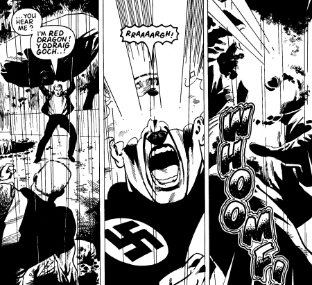 Years later, when the villain Masterman returned, Voltage and Zenith (the child of Dr Beat and White Heat) sought out his aid in stopping the Nazi monster. They found Siadwel a drunk, having spent years drowning his fears and concerns about Lux's plan in alcohol. Zenith reluctantly set about drying him out and getting him back into shape - the youth's attitude being less that of getting an ally for the coming fight and more one of trying to find someone else to do all the fighting for him. Once sober the heroic side of the Red Dragon re-asserted itself; he and Zenith flew to London, only to find Voltage already under attack by their foe outside the Houses of Parliament. Red Dragon stopped Masterman from killing Voltage, but unfortunately he died almost instantly when the villain burned his face off. He was buried in Wales.