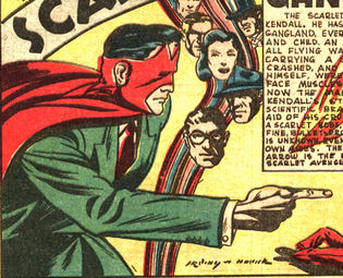 Powers/Abilities: Though the Scarlet Avenger had no innate superpowers, he was a scientific genius and utilized an array of super-scientific weapons he had created, including a bulletproof cloak, a hypnotic device used for extracting confessions, a magnetic ray and a paralysis ray. He was also an expert at the martial art of Ju Jitsu. He used both a rocket car and a high tech aircraft as transportation.