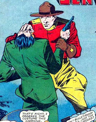 History: With America threatened by saboteurs, former Ohio State University football star Don Lawson was inspired by the example of his father, who had died a hero while serving his country, and purchased a mail order bulletproof Mountie costume (I am not making this up!) to become the crimefighting Scarlet Sentry.