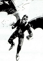 |  | We also have this guy. Looking at his wings, I think he is a take-off on the Hotspur character Black Hawk. Later pictures of him flying with them certainly resemble the picture on the right. He survives the destruction of his world and goes to make a new home in the Black Archer's home dimension. One e-mailer, Paul (no last name given) notes that "Don't know if this is stating the obvious, but if you consider the time when Zenith was produced and the " indie" bent of Messrs Morrison & Yeowell, but, it's always seemed to me that...Black Hawk"s Zenith depiction", bears a resemblance to Clint Boon of the Inspiral Carpets." Certainly does look a lot like that, now he comes to mention it. |  |