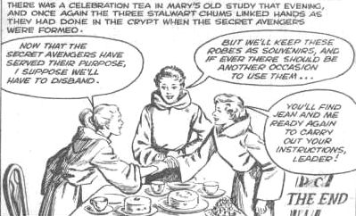 History: After Norah Staveley framed her, causing her to be expelled from Priory School, former head girl Mary Wallis secretly returned to the school at the start of the next term, donning a hooded costume to become the Secret Avenger. She soon recruited two trustworthy friends, Linda Blake and Jean Chalmers, to become her co-conspirators, forming the Secret Avengers. They soon discovered that Norah had wanted to have the use of the Head Girl's study because it gave access to a hidden passage used by Sir Richard Tressidor, who had owned the priory at the time of the English Civil War, a passage that Norah's crooked uncle could use to smuggle goods. Caught in the act, Norah confessed her crimes, exonerating Mary, allowing her to be reinstated as Head Girl.