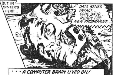 The pictures on this page showing Sintek's bionic limbs was a common artistic trick in the strip, where they would show the reader his bionic parts by drawing him as if his skin was transparent. Appearances not-withstanding, Sintek actually looked fully human with no visible bionics.