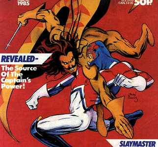 Powers/Abilities: Slaymaster was a master of armed and unarmed combat, skilled in various martial arts. He could spot opponents vulnerable points, and at close range could strike almost too swiftly to be seen. His left hand was coated in a thick, lethally sharpened callous. He was a disguise master, adopting new identities in seconds. He carried weapons ranging from conventional blades, bombs and firearms to gas guns, explosive bullets, strength-enhancing atomic-wristlets, claw gauntlets and nerve-disrupting Jazzlers; he flew using a jet-belt and had a flying rocket-car. He later wore a costume which boosted his strength (lifting 60 tons) and speed.