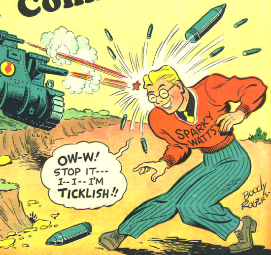 History: Trying to pay his way through college by selling magazines, Sparky Watts knocked on the door of eccentric inventor Doc Static, who agreed to make a purchase if Sparky let Doc perform an experiment on him. He irradiated Sparky with cosmic rays, which gave him superhuman powers, which he went on to use to fight evil, such as Axis forces and criminal gangs.