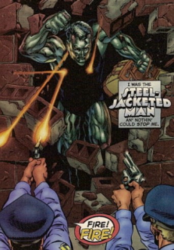Powers/Abilities: His powers are more or less that he is composed of steel- he is very heavy (700 lbs plus) and very strong.