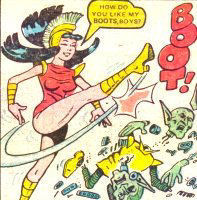 Powers/Abilities: Sue transforms into Tanya whenever any one of the group says or even writes the phrase Rings of Zorr. Tanya can fire lasers from her fingertips, can fly and is capable of going into outer space without a suit on, even flying interstellar distances in minutes, though the ability to survive in space is apparently down to a spell cast by Blue Wizard, rather than her own powers. She also demonstrates powers of "deep hypnosis" at one point. In Zenith she appeared to have superstrength and bulletproof skin too.