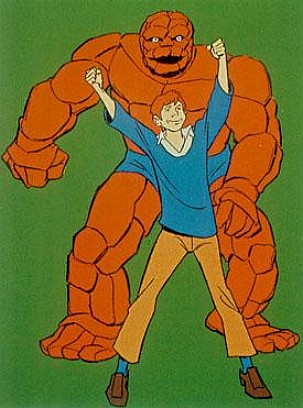 A Hanna Barbera adaption, run as part of the "Fred And Barney Meet The Thing" show, it's the least faithful adaption of any Marvel character ever. The Thing is a boy, Benjy Grimm, who transforms into the rocky superhero by touching magic rings together and reciting a dodgy incantation, "Thing ring, do your thing!." The rest of the Marvel Universe doesn't appear, and the character has a whole new origin, supporting cast, and enemies. Luckily, despite the title, the Thing only encounters Fred Flintstone and Barney Rubble in the titles sequence. There were 26 eleven minute episodes made.