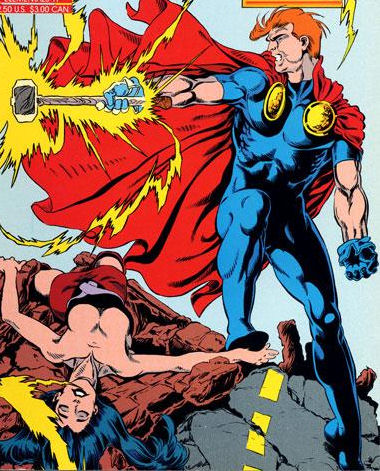 History: Thor is the actual Asgardian God of Thunder. After Ragnarok in the mid 1940's (which the Gods lost), Thor retired to the moon, where he spent much of his time watching sitcoms. In the mid-80's he returned to Earth to relieve his boredom by fighting the Elementals, who he had seen on TV. Later, when Lord Oblivion returned to our solar system with Hell in tow Thor became one of the main fighters against his demonic armies.