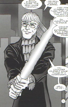 History: Vain led the group of super powered agents sent by Mr.Tanaka to retrieve Watch members Adapt and the Fisher while the two men were in New York. He observed through binoculars as Entropist shot both men through the head, then sent Zero in to check their status. Both targets survived due to their individual powers. Zero stunned Adapt, but was in turn killed by the Fisher. Vain then moved in and dueled with the Fisher, aided by Entropist's powers. The Fisher was by far the better swordsman, but just before he could deliver a fatal blow to Vain, Entropist caused his sword to break. Vain then ran him through. The two surviving Tanaka agents waited for the retrieval helicopters, but the Fisher regenerated his wound unnoticed by either man. He stood up behind Vain a cracked him across the head with the flat of what was left of his sword, then murdered Entropist. While he was doing this last, Vain took the chance to flee, climbing up a ladder into a newly arrived helicopter.