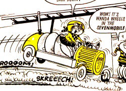 Wanda can drive the Sevenmobile, a powerful go kart, with amazing skill.