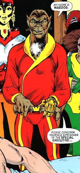 History: Wardog is a parahuman from another dimension. It has been suggested that he is in fact a Gallifreyan, the same species as the mysterious time traveller known as the Doctor. Whatever the truth about his origins, we do know that he is the leader of a team of bizarre beings who travel between times and dimensions taking missions for hire: interdimensional mercenaries.