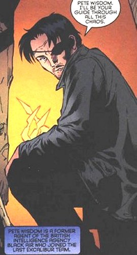 Powers/Abilities: Pete Wisdom can generate "hot knives", semi-solid energy projections, from the tips of his fingers. He can use these as slashing weapons, but more commonly fires them off as deadly, high velocity, projectiles. Pete has excellent control of the power level of his knives, and can make them weak enough to purely stun, or (Pete claims) hotter than the heart of the sun.